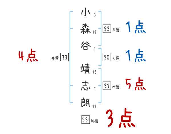 外運![]() | 小森谷靖志朗さんの外運は33画の4つ星!権力志向でプライドが高い。勇気があり運を切り開き成功する。 生活面を象徴する運勢です。外部から受ける影響力を表し、結婚運、家庭運や職場、環境への順応性を表します。 |