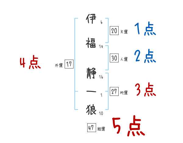 総運![]() | 伊福静一狼さんの総運は47画の5つ星!実力が開花し発展する円満な人生。財に恵まれる。 あなたの人生を表す1番重要な運勢です。生涯を通じて影響する総合運となり、主に50歳以降の晩年期に影響を及ぼします。 |