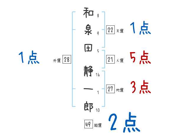 外運![]() | 和泉田静一郎さんの外運は28画の1つ星!家庭環境に注意。スポーツで活躍できる能力があるかも。 生活面を象徴する運勢です。外部から受ける影響力を表し、結婚運、家庭運や職場、環境への順応性を表します。 |