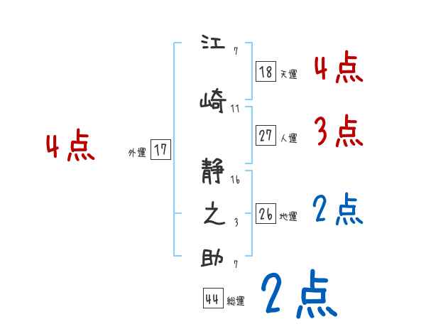 外運![]() | 江崎静之助さんの外運は17画の4つ星!積極的な行動力。地位を気づき財産を手に入れる。純粋な心と直感力。 生活面を象徴する運勢です。外部から受ける影響力を表し、結婚運、家庭運や職場、環境への順応性を表します。 |