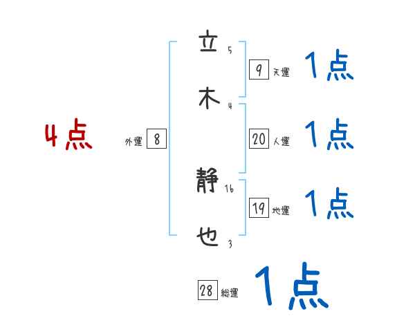 総運![]() | 立木静也さんの総運は28画の1つ星!家庭環境に注意。スポーツで活躍できる能力があるかも。 あなたの人生を表す1番重要な運勢です。生涯を通じて影響する総合運となり、主に50歳以降の晩年期に影響を及ぼします。 |