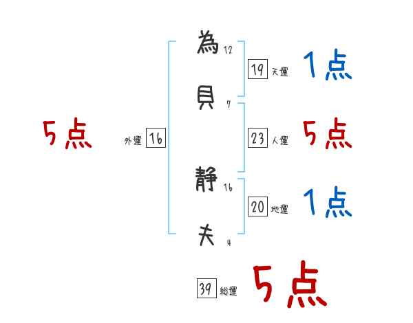 外運![]() | 為貝静夫さんの外運は16画の5つ星!人望が厚く大きく発展する。逆転成功が見える。 生活面を象徴する運勢です。外部から受ける影響力を表し、結婚運、家庭運や職場、環境への順応性を表します。 |