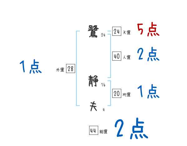 外運![]() | 鷺静夫さんの外運は28画の1つ星!家庭環境に注意。スポーツで活躍できる能力があるかも。 生活面を象徴する運勢です。外部から受ける影響力を表し、結婚運、家庭運や職場、環境への順応性を表します。 |