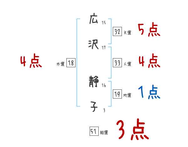 天運![]() | 広沢静子さんの天運は32画の5つ星!柔軟性があり成功する。チャンスが多く金運が良い。 家系が持つ宿命的な運勢を表します。祖先から受け継いだ苗字ですので自分の力が及びません。家柄を象徴します。 |