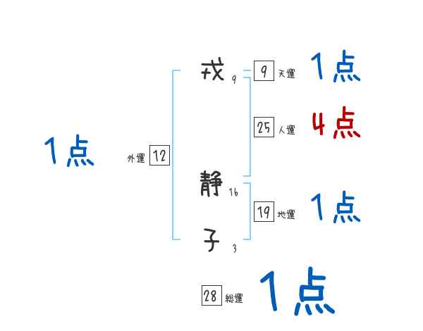 天運![]() | 戎静子さんの天運は9画の1つ星!消極的で才能を発揮することが苦手なことも。周りの意見に耳を傾けましょう。 家系が持つ宿命的な運勢を表します。祖先から受け継いだ苗字ですので自分の力が及びません。家柄を象徴します。 |