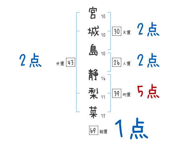 総運![]() | 宮城島静梨菜さんの総運は69画の1つ星!不満を感じやすい傾向が。ストレスを貯めないように注意しましょう。 あなたの人生を表す1番重要な運勢です。生涯を通じて影響する総合運となり、主に50歳以降の晩年期に影響を及ぼします。 |