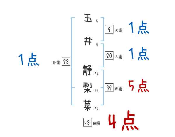 外運![]() | 玉井静梨菜さんの外運は28画の1つ星!家庭環境に注意。スポーツで活躍できる能力があるかも。 生活面を象徴する運勢です。外部から受ける影響力を表し、結婚運、家庭運や職場、環境への順応性を表します。 |