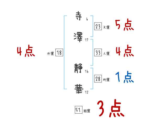 天運![]() | 寺澤静華さんの天運は23画の5つ星!想像力に優れ活力がある。一代で成功し名誉を手に入れる。 家系が持つ宿命的な運勢を表します。祖先から受け継いだ苗字ですので自分の力が及びません。家柄を象徴します。 |