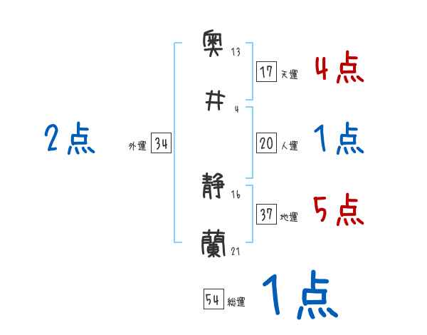 外運![]() | 奥井静蘭さんの外運は34画の2つ星!独創性に優れるが、自尊心が強く災難に注意しましょう。 生活面を象徴する運勢です。外部から受ける影響力を表し、結婚運、家庭運や職場、環境への順応性を表します。 |