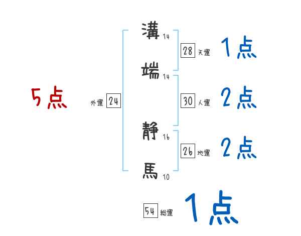 外運![]() | 溝端静馬さんの外運は24画の5つ星!家庭運が良く順調な人生。金運にも恵まれる。 生活面を象徴する運勢です。外部から受ける影響力を表し、結婚運、家庭運や職場、環境への順応性を表します。 |