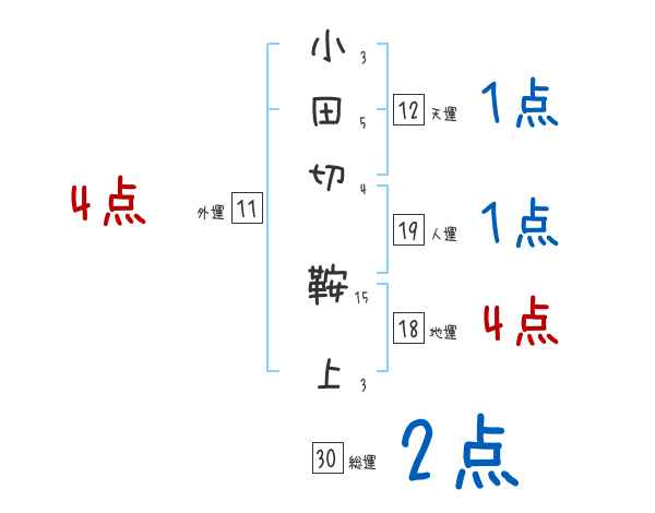 人運![]() | 小田切鞍上さんの人運は19画の1つ星!優れた才能を持ちますが、協調性が足りないことも。周りの人と協力する事を意識しましょう。 性格や才能などを表す2番目に重要な運勢です。人間関係や協調性、社会的な成功に影響します。主に20歳から50歳ぐらいまでの中年期の運勢を表します。 |