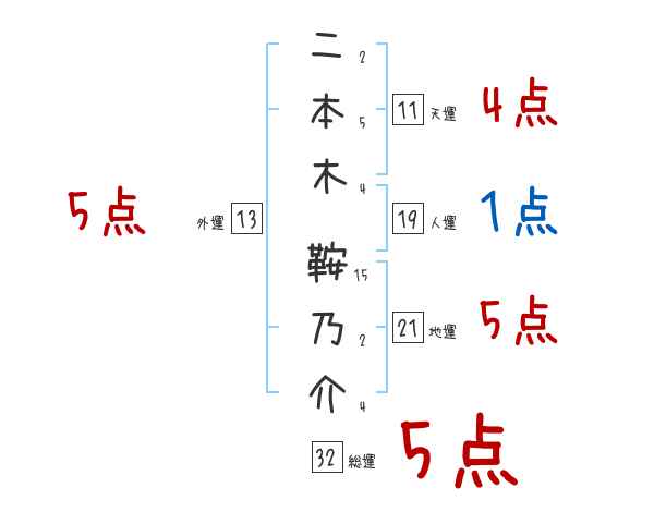 総運![]() | 二本木鞍乃介さんの総運は32画の5つ星!柔軟性があり成功する。チャンスが多く金運が良い。 あなたの人生を表す1番重要な運勢です。生涯を通じて影響する総合運となり、主に50歳以降の晩年期に影響を及ぼします。 |
