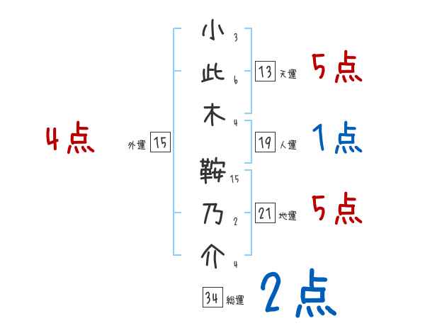 天運![]() | 小此木鞍乃介さんの天運は13画の5つ星!才能に恵まれ人気がある。名声を手に入れる。円満な人生。 家系が持つ宿命的な運勢を表します。祖先から受け継いだ苗字ですので自分の力が及びません。家柄を象徴します。 |
