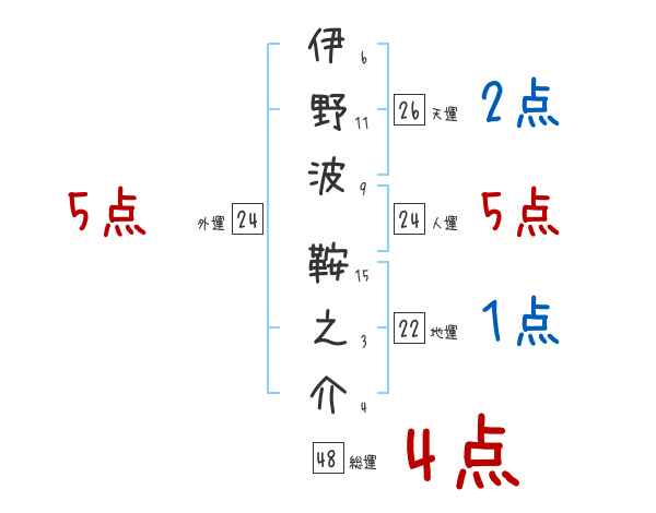 外運![]() | 伊野波鞍之介さんの外運は24画の5つ星!家庭運が良く順調な人生。金運にも恵まれる。 生活面を象徴する運勢です。外部から受ける影響力を表し、結婚運、家庭運や職場、環境への順応性を表します。 |