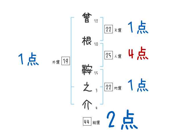 総運![]() | 曾根鞍之介さんの総運は44画の2つ星!誠実で慎重な性格。物事を考えすぎないように注意しましょう。 あなたの人生を表す1番重要な運勢です。生涯を通じて影響する総合運となり、主に50歳以降の晩年期に影響を及ぼします。 |