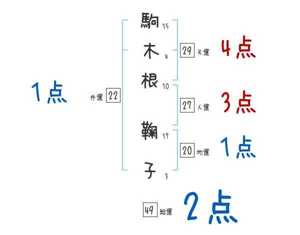 外運![]() | 駒木根鞠子さんの外運は22画の1つ星!努力することが苦手ないっぽう手先が器用。芸術性にも優れる。 生活面を象徴する運勢です。外部から受ける影響力を表し、結婚運、家庭運や職場、環境への順応性を表します。 |