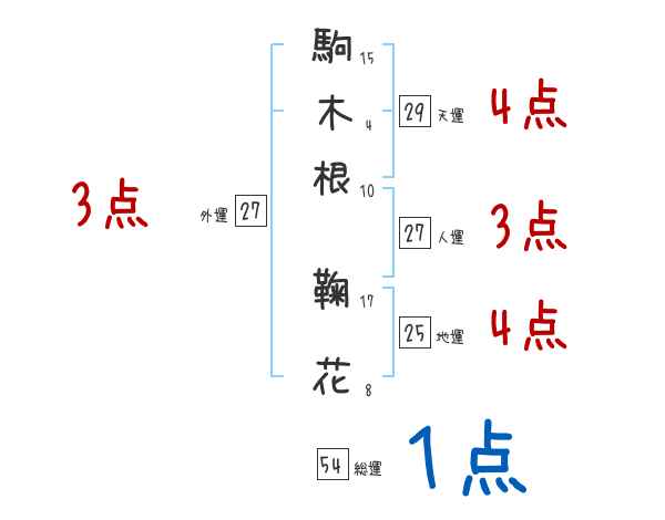 総運![]() | 駒木根鞠花さんの総運は54画の1つ星!トラブルが多いかも。周りをよく見て協調して過ごしましょう。 あなたの人生を表す1番重要な運勢です。生涯を通じて影響する総合運となり、主に50歳以降の晩年期に影響を及ぼします。 |