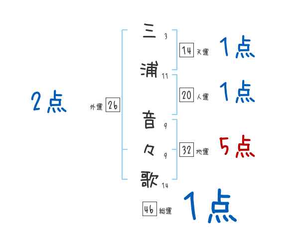 外運![]() | 三浦音々歌さんの外運は26画の2つ星!波瀾万丈かも。信頼できる人を大事にしましょう。 生活面を象徴する運勢です。外部から受ける影響力を表し、結婚運、家庭運や職場、環境への順応性を表します。 |