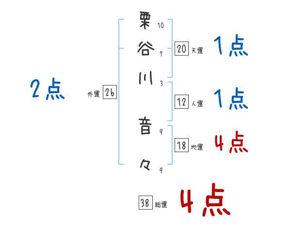 外運![]() | 栗谷川音々さんの外運は26画の2つ星!波瀾万丈かも。信頼できる人を大事にしましょう。 生活面を象徴する運勢です。外部から受ける影響力を表し、結婚運、家庭運や職場、環境への順応性を表します。 |