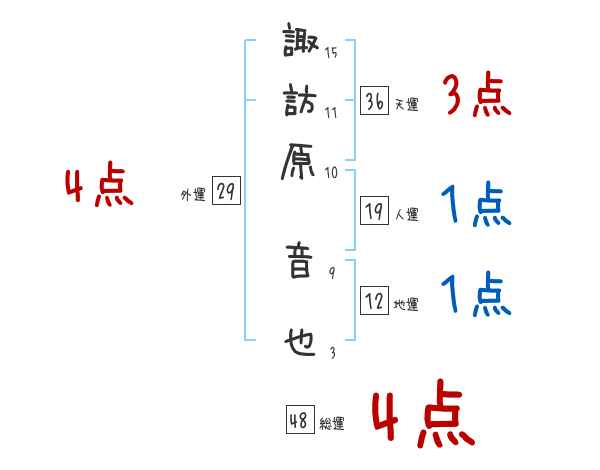 天運![]() | 諏訪原音也さんの天運は36画の3つ星!先見性が豊かです。多少神経質で苦労することも。 家系が持つ宿命的な運勢を表します。祖先から受け継いだ苗字ですので自分の力が及びません。家柄を象徴します。 |