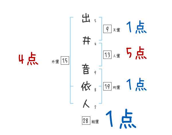 人運![]() | 出井音依人さんの人運は13画の5つ星!才能に恵まれ人気がある。名声を手に入れる。円満な人生。 性格や才能などを表す2番目に重要な運勢です。人間関係や協調性、社会的な成功に影響します。主に20歳から50歳ぐらいまでの中年期の運勢を表します。 |
