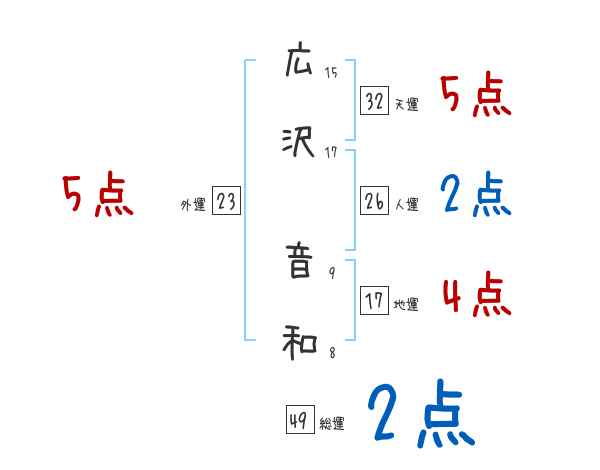 天運![]() | 広沢音和さんの天運は32画の5つ星!柔軟性があり成功する。チャンスが多く金運が良い。 家系が持つ宿命的な運勢を表します。祖先から受け継いだ苗字ですので自分の力が及びません。家柄を象徴します。 |
