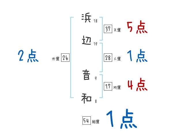 人運![]() | 浜辺音和さんの人運は28画の1つ星!家庭環境に注意。スポーツで活躍できる能力があるかも。 性格や才能などを表す2番目に重要な運勢です。人間関係や協調性、社会的な成功に影響します。主に20歳から50歳ぐらいまでの中年期の運勢を表します。 |