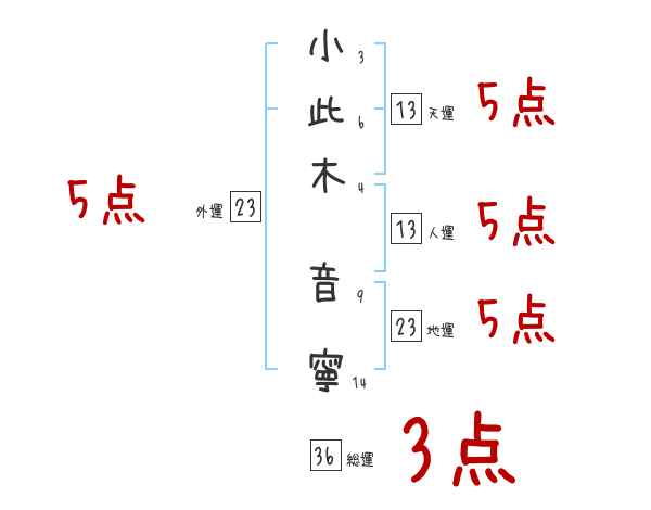 総運![]() | 小此木音寧さんの総運は36画の3つ星!先見性が豊かです。多少神経質で苦労することも。 あなたの人生を表す1番重要な運勢です。生涯を通じて影響する総合運となり、主に50歳以降の晩年期に影響を及ぼします。 |