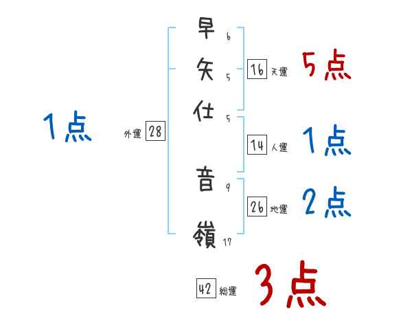地運![]() | 早矢仕音嶺さんの地運は26画の2つ星!波瀾万丈かも。信頼できる人を大事にしましょう。 個性を表す基礎的な運勢です。性格形成や対人関係、行動力など家庭環境に影響されます。主に誕生してから20歳くらいまでの若年期の運勢を表します。 |
