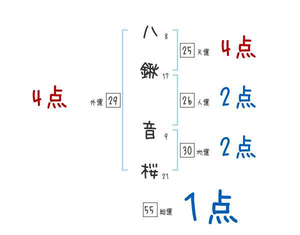 天運![]() | 八鍬音桜さんの天運は25画の4つ星!個性があり才能があふれる。強運の持ち主で発展する。 家系が持つ宿命的な運勢を表します。祖先から受け継いだ苗字ですので自分の力が及びません。家柄を象徴します。 |