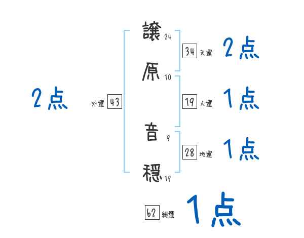 天運![]() | 譲原音穏さんの天運は34画の2つ星!独創性に優れるが、自尊心が強く災難に注意しましょう。 家系が持つ宿命的な運勢を表します。祖先から受け継いだ苗字ですので自分の力が及びません。家柄を象徴します。 |