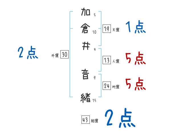 総運![]() | 加倉井音緒さんの総運は43画の2つ星!頑固な性格で独立心が強いかも。やや非現実的で浪費に注意しましょう。 あなたの人生を表す1番重要な運勢です。生涯を通じて影響する総合運となり、主に50歳以降の晩年期に影響を及ぼします。 |