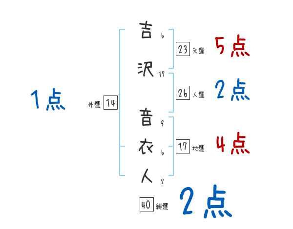 総運![]() | 吉沢音衣人さんの総運は40画の2つ星!自信過剰で物事に固執するためトラブルに注意。 あなたの人生を表す1番重要な運勢です。生涯を通じて影響する総合運となり、主に50歳以降の晩年期に影響を及ぼします。 |
