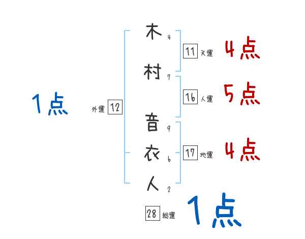 天運![]() | 木村音衣人さんの天運は11画の4つ星!着実に富や地位を得る幸運な人生。 家系が持つ宿命的な運勢を表します。祖先から受け継いだ苗字ですので自分の力が及びません。家柄を象徴します。 |