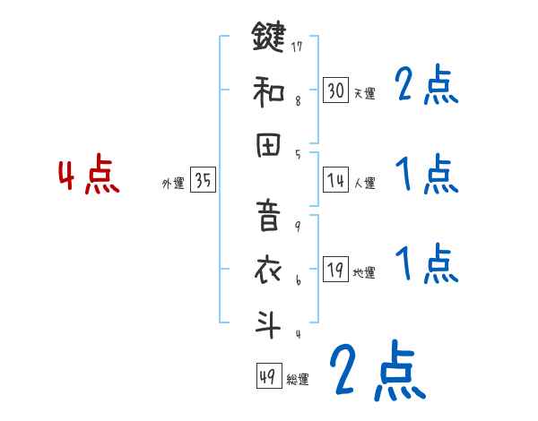 外運![]() | 鍵和田音衣斗さんの外運は35画の4つ星!温厚な性格で感受性が高い。穏和な性格で人望が厚い。 生活面を象徴する運勢です。外部から受ける影響力を表し、結婚運、家庭運や職場、環境への順応性を表します。 |