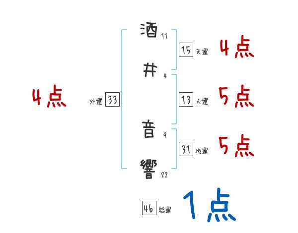 外運![]() | 酒井音響さんの外運は33画の4つ星!権力志向でプライドが高い。勇気があり運を切り開き成功する。 生活面を象徴する運勢です。外部から受ける影響力を表し、結婚運、家庭運や職場、環境への順応性を表します。 |