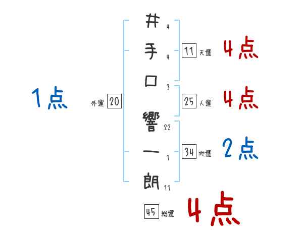 天運![]() | 井手口響一朗さんの天運は11画の4つ星!着実に富や地位を得る幸運な人生。 家系が持つ宿命的な運勢を表します。祖先から受け継いだ苗字ですので自分の力が及びません。家柄を象徴します。 |