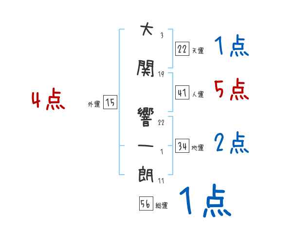 天運![]() | 大関響一朗さんの天運は22画の1つ星!努力することが苦手ないっぽう手先が器用。芸術性にも優れる。 家系が持つ宿命的な運勢を表します。祖先から受け継いだ苗字ですので自分の力が及びません。家柄を象徴します。 |