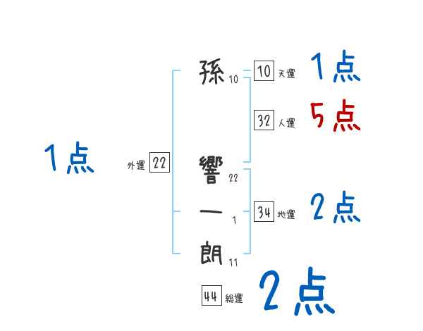 天運![]() | 孫響一朗さんの天運は10画の1つ星!不安を感じやすい傾向。ストレスを抱えないように注意しましょう。 家系が持つ宿命的な運勢を表します。祖先から受け継いだ苗字ですので自分の力が及びません。家柄を象徴します。 |