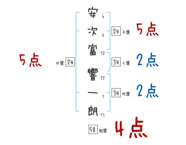天運![]() | 安次富響一朗さんの天運は24画の5つ星!家庭運が良く順調な人生。金運にも恵まれる。 家系が持つ宿命的な運勢を表します。祖先から受け継いだ苗字ですので自分の力が及びません。家柄を象徴します。 |