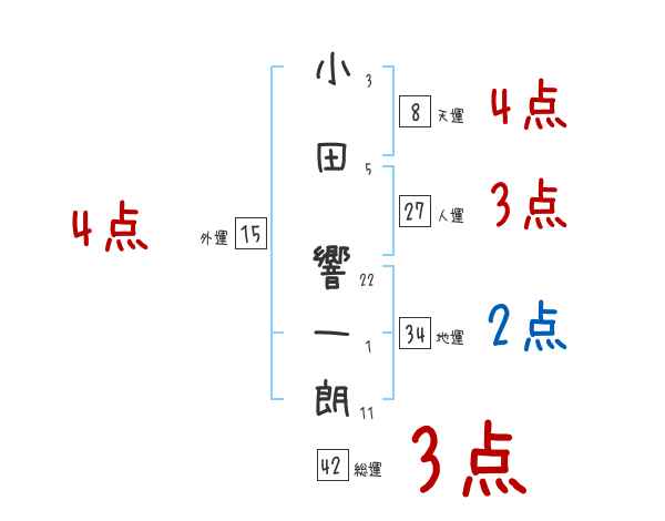 総運![]() | 小田響一朗さんの総運は42画の3つ星!病気に注意。多芸であるが消極的でおとなしい。 あなたの人生を表す1番重要な運勢です。生涯を通じて影響する総合運となり、主に50歳以降の晩年期に影響を及ぼします。 |