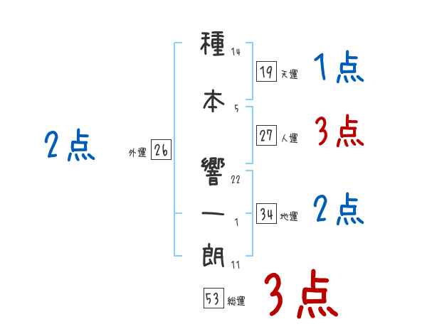 総運![]() | 種本響一朗さんの総運は53画の3つ星!やや見栄っ張りで虚栄心がある。散財に注意。 あなたの人生を表す1番重要な運勢です。生涯を通じて影響する総合運となり、主に50歳以降の晩年期に影響を及ぼします。 |