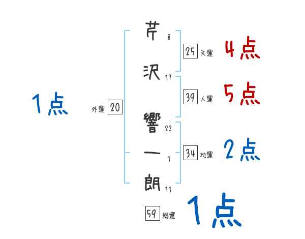 天運![]() | 芹沢響一朗さんの天運は25画の4つ星!個性があり才能があふれる。強運の持ち主で発展する。 家系が持つ宿命的な運勢を表します。祖先から受け継いだ苗字ですので自分の力が及びません。家柄を象徴します。 |