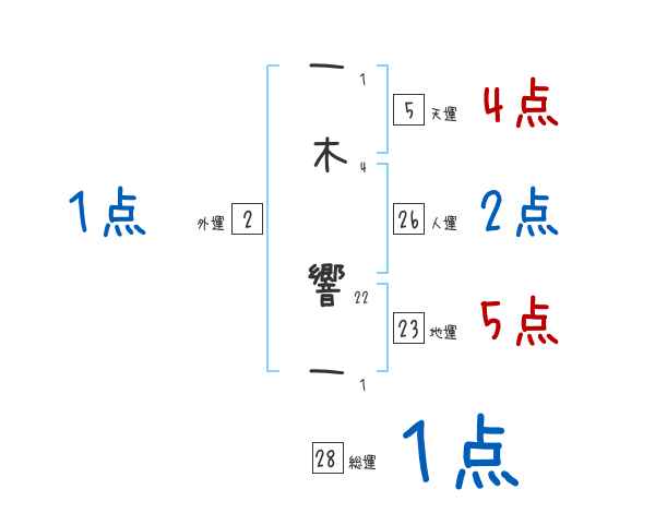 総運![]() | 一木響一さんの総運は28画の1つ星!家庭環境に注意。スポーツで活躍できる能力があるかも。 あなたの人生を表す1番重要な運勢です。生涯を通じて影響する総合運となり、主に50歳以降の晩年期に影響を及ぼします。 |