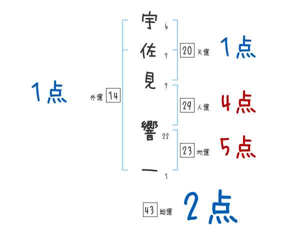 総運![]() | 宇佐見響一さんの総運は43画の2つ星!頑固な性格で独立心が強いかも。やや非現実的で浪費に注意しましょう。 あなたの人生を表す1番重要な運勢です。生涯を通じて影響する総合運となり、主に50歳以降の晩年期に影響を及ぼします。 |