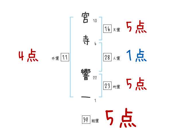 総運![]() | 宮寺響一さんの総運は39画の5つ星!社交性に優れ人望が厚い。人の上に立ち成功する。 あなたの人生を表す1番重要な運勢です。生涯を通じて影響する総合運となり、主に50歳以降の晩年期に影響を及ぼします。 |
