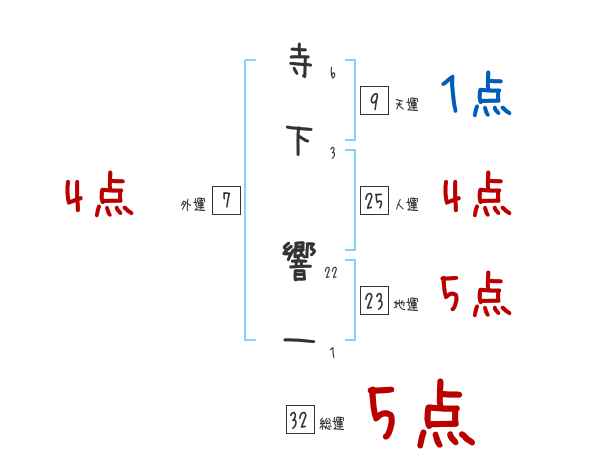 総運![]() | 寺下響一さんの総運は32画の5つ星!柔軟性があり成功する。チャンスが多く金運が良い。 あなたの人生を表す1番重要な運勢です。生涯を通じて影響する総合運となり、主に50歳以降の晩年期に影響を及ぼします。 |