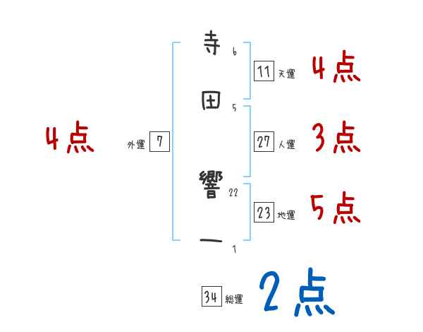 総運![]() | 寺田響一さんの総運は34画の2つ星!独創性に優れるが、自尊心が強く災難に注意しましょう。 あなたの人生を表す1番重要な運勢です。生涯を通じて影響する総合運となり、主に50歳以降の晩年期に影響を及ぼします。 |