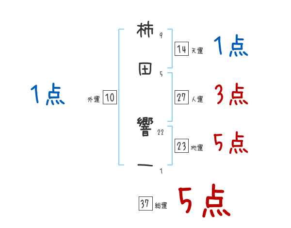 天運![]() | 柿田響一さんの天運は14画の1つ星!人に対して優しいがストレスを溜め込みがち。人間関係のトラブルを避けるよう気をつけましょう。 家系が持つ宿命的な運勢を表します。祖先から受け継いだ苗字ですので自分の力が及びません。家柄を象徴します。 |
