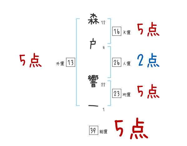総運![]() | 森戸響一さんの総運は39画の5つ星!社交性に優れ人望が厚い。人の上に立ち成功する。 あなたの人生を表す1番重要な運勢です。生涯を通じて影響する総合運となり、主に50歳以降の晩年期に影響を及ぼします。 |